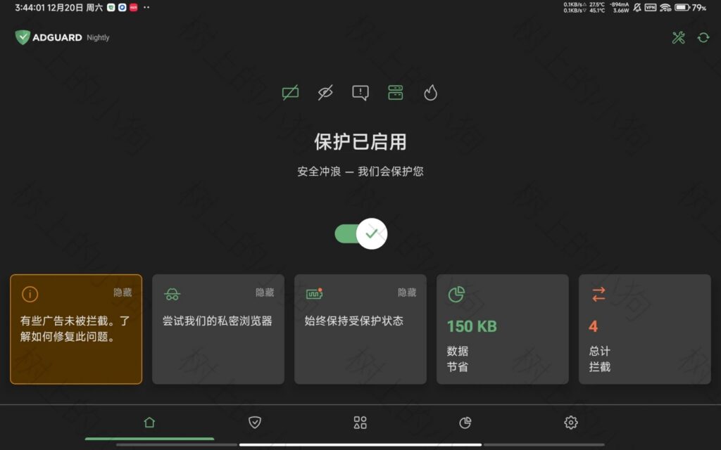 截与隐私保护工具,无需 Root 权限,通过本地 VPN 技术拦截浏览器及应用内广告、视频广告等。免费版可拦截浏览器广告,付费版解锁应用内广告拦截、跟踪保护、安全浏览等功能。支持自定义过滤器与 DNS 保护,能屏蔽跟踪器、恶意网站,节省流量与电量。