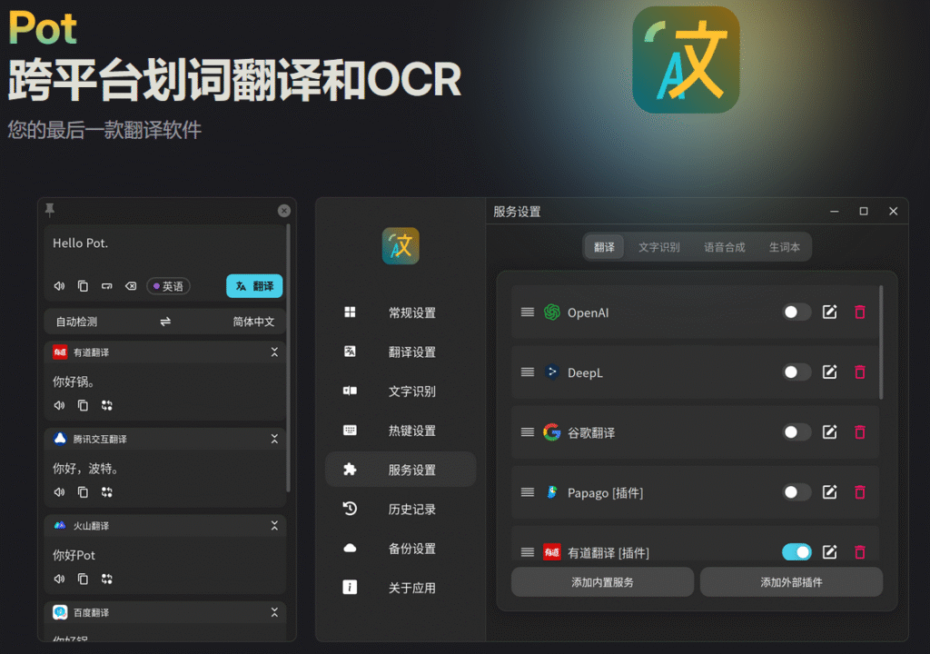 Pot Translation & OCR 是跨平台翻译与 OCR 工具,支持 Windows、macOS、Linux。核心功能含划词 / 截图 / 输入 / 剪贴板翻译,集成 DeepL、OpenAI 等 20 + 接口,也有 300 万词条离线词典与 PaddleOCR 等离线识别。支持语音合成、生词本同步 Anki,插件系统可自定义功能。开源免费无广告,轻量高效!