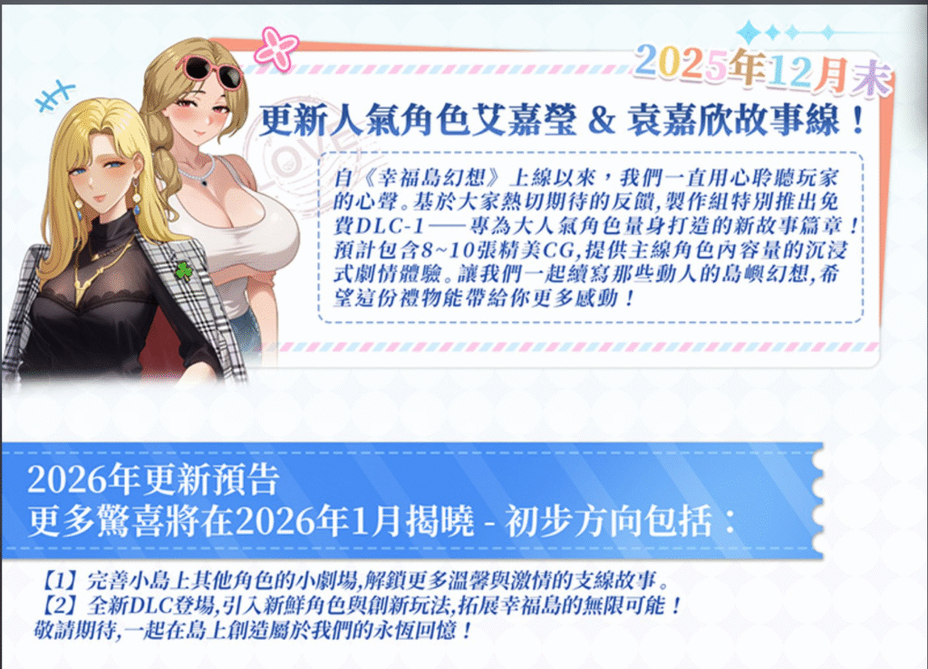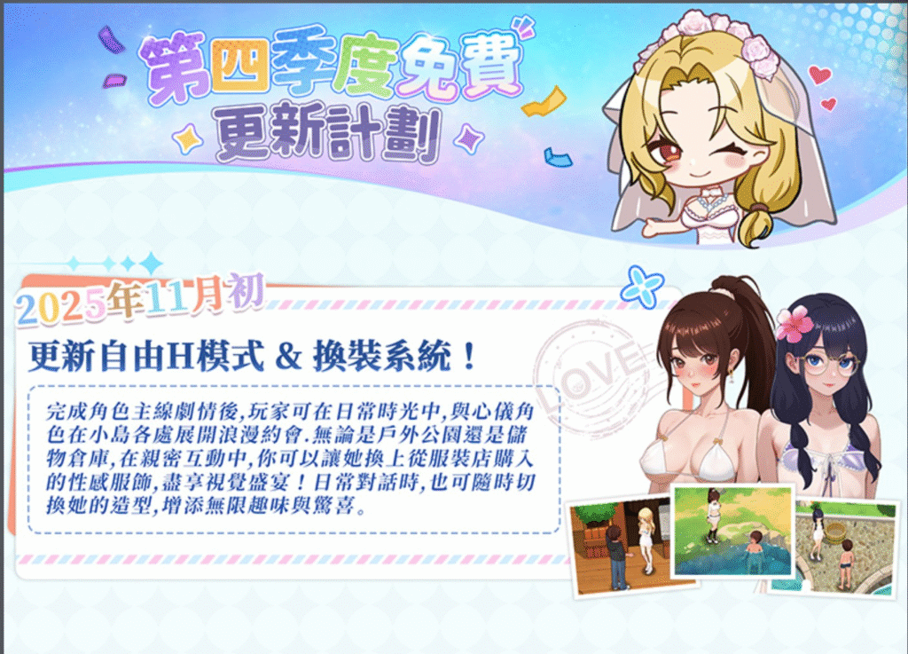 自由H模式:在岛屿各处随时随地激情H,让您以全新方式亲近喜爱角色,尽享沉浸式浪漫!
