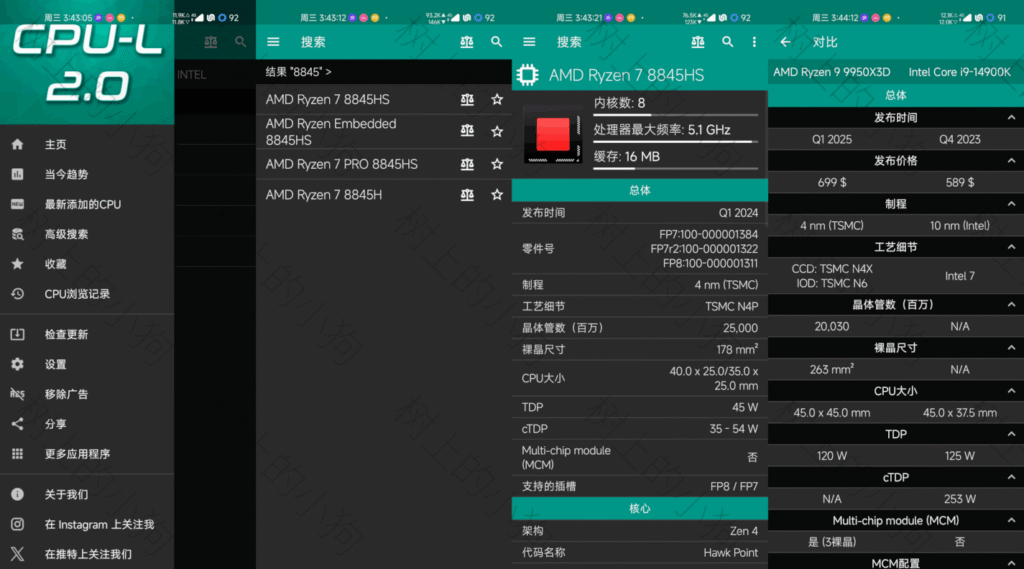 CPU-L 是 iJR Software 开发的专业 CPU 参数查询与对比工具。它收录 1500+ AMD、3300+ Intel CPU 详细参数,含 600+ CPU 实物图,可查基准分数,支持高级筛选搜索、收藏常用型号,还能离线使用(部分功能需联网),最多对比 10 款 CPU,适配电脑 DIY、硬件选购等场景,数据库可 OTA 更新,界面简洁易操作。