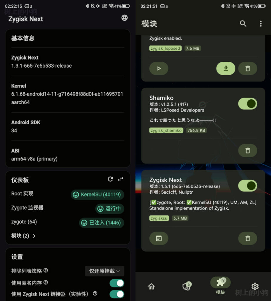 核心提供 Zygisk API 支持,可在非 Magisk 环境运行 Magisk 模块,ROOT 屏蔽能力强劲。支持进程注入扩展,兼容 LSPosed 等热门模块,Magisk 用户需停用内置 Zygisk 使用。