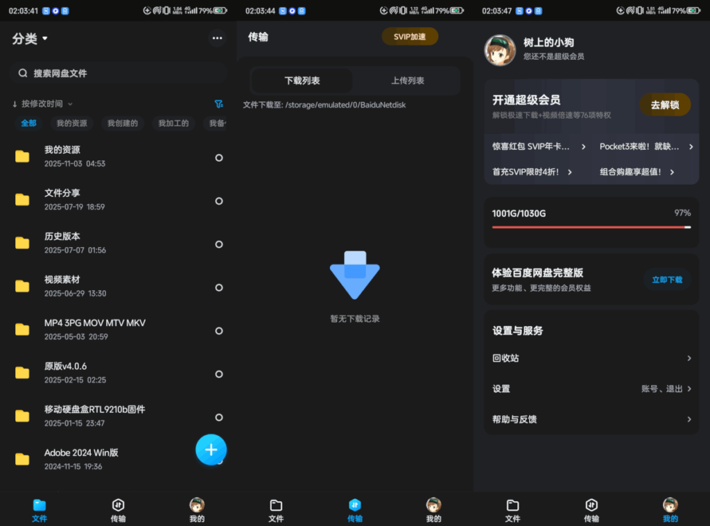 核心保留文件上传、下载、分享等核心功能,彻底去除所有内置广告与冗余模块,界面纯净清爽。非会员下载速度显著提升,会员可享满速传输,支持跨设备数据同步与微信文件、通话记录等自动备份。