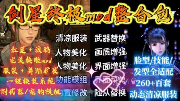绅士必冲!剑星终极mod整合包:红莲4.0+渡鸦终极mod,脸型/技能/发型全适配260+百套动态清凉服装+舞蹈扩展|一键换装系统|附武器/宠物DORO模
