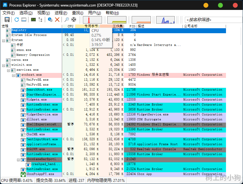 Process Explorer 是微软出品的 Windows 高级进程管理工具,可替代系统自带任务管理器。能实时显示进程详细信息,包括 PID、父进程、内存占用、CPU 使用率及关联的 DLL / 句柄。支持查找占用文件的进程、终止顽固进程,还可监控进程网络活动与资源消耗。