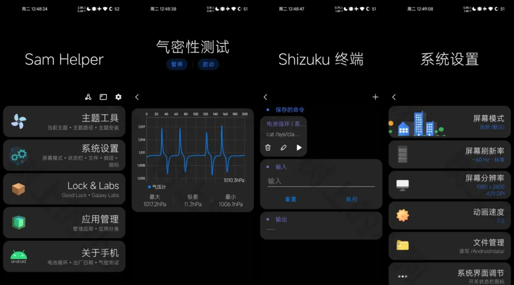 三星工具箱 Sam Helper 是安卓系统工具箱。核心为系统精细调节(分辨率 / DPI / 刷新率 / 动画速度,需 ADB/Shizuku/ROOT)、自定义主题 / 字体安装、气密性 / 电池 / 固件 / 出厂信息等硬件诊断,整合 Good Lock/Galaxy Labs 并快捷管理模块,ADB 授权即可深度优化,是设备个性化与管理工具。