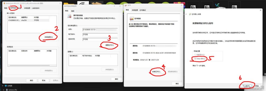 右键安装包 > 选择数字签名 > 点击详细信息 > 点击查看证书 > 点击安装证书 > 选择本地计算机 > 点击下一步