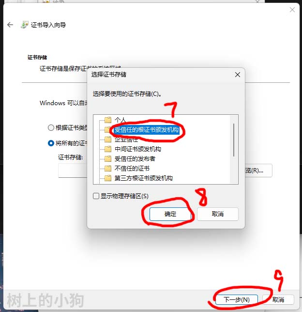 点击将所有的证书都放入下列存储(P) > 点击受信任的根证书颁发机构 > 点击确认 > 一路确认